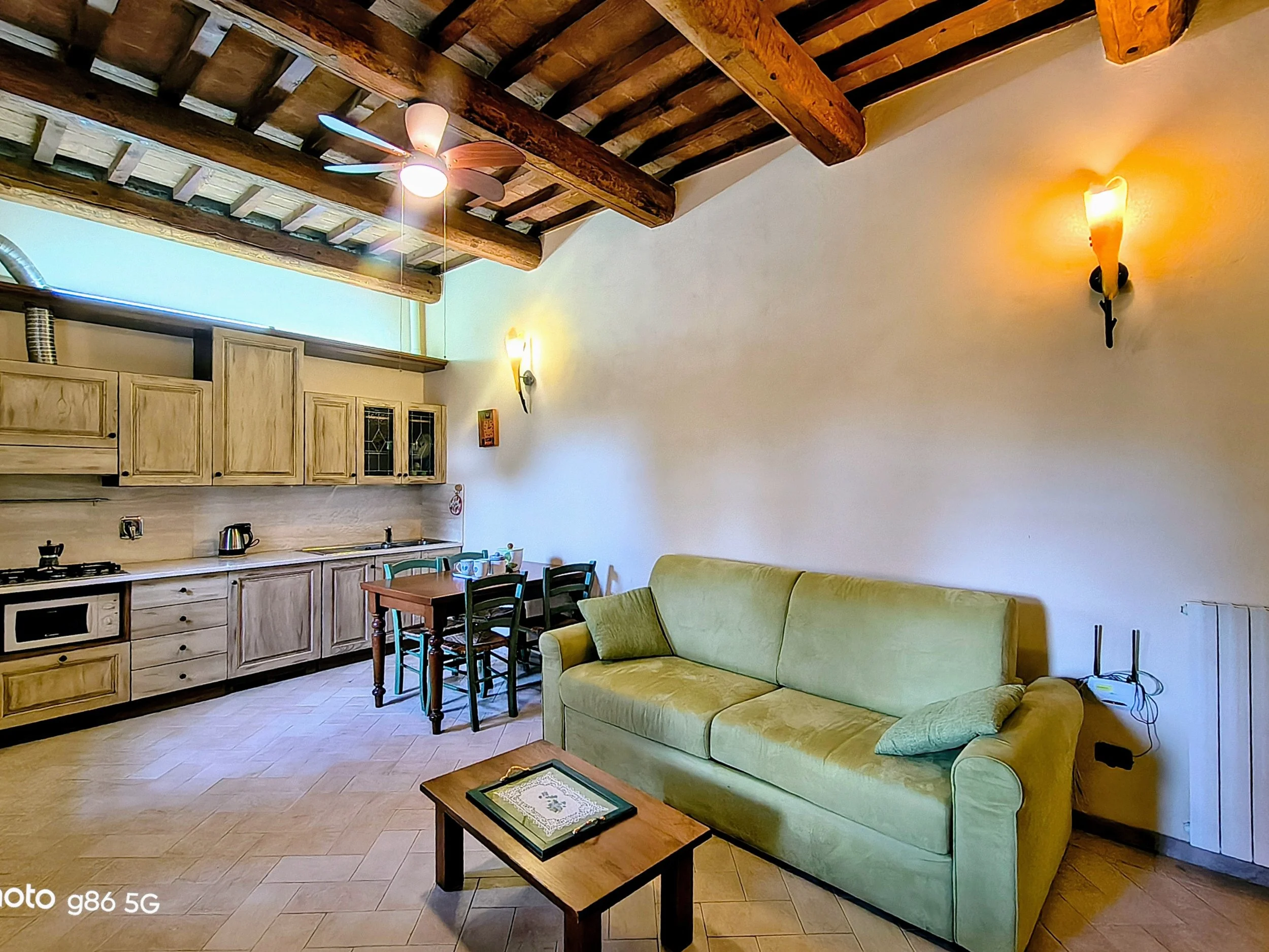 Apartment with external staircase, all on one floor, consisting of a double bedroom with a panoramic equipped terrace, bathroom, large living room with double sofa bed and side kitchen. The environment is naturally fresh, ceiling fun in bedroom and living room.